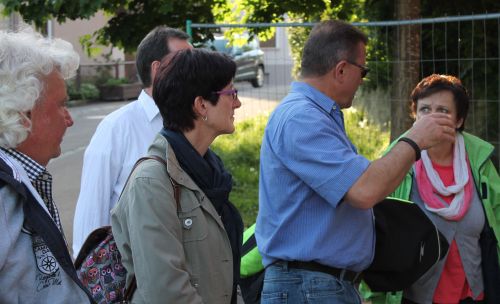 Bei strahlendem Sonnenschein trafen sich die Gemeinderatskandidaten und interessierte Bürgerinnen und Bürger am 5. Mai am Rathaus zum „Kommunalpolitischen Spaziergang“. Bereits bei der provisorischen Fußgängerampel gab es ersten Diskussionsbedarf.