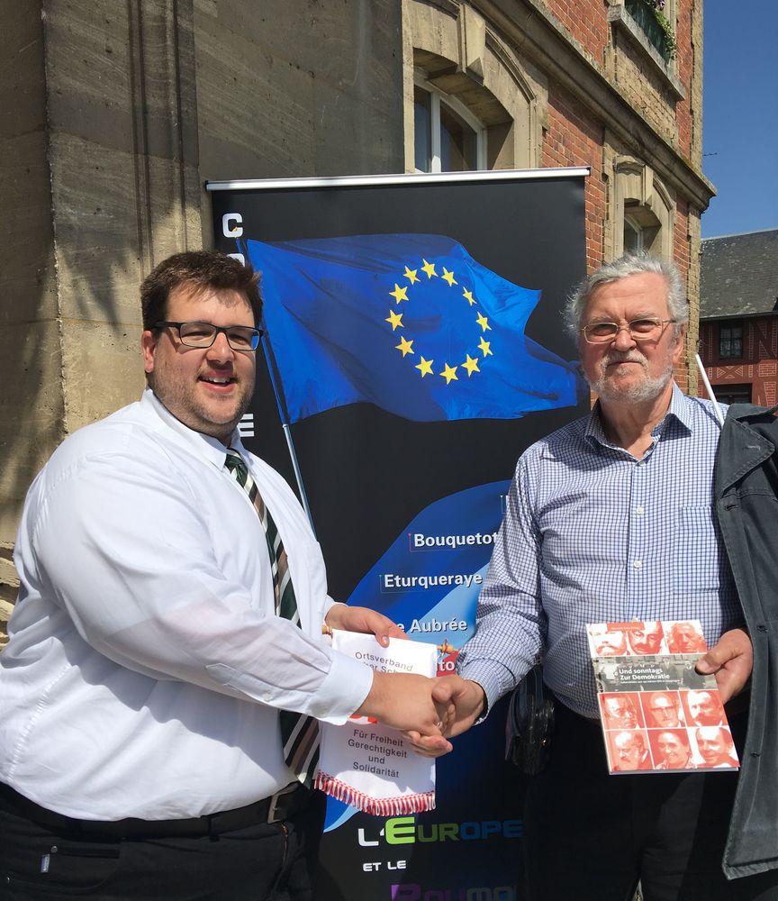 Der Ortsvereinsvorsitzende Benjamin Christian tauschte sich mit dem Repräsentanten der PS für die Region de Routot über die Situation in Frankreich vor den Parlamentswahlen aus. Als Geschenk überreichte der Wangener Ortsverein einen Wimpel sowie ein Buch über die über 140-jährige Geschichte der SPD im Raum Göppingen.